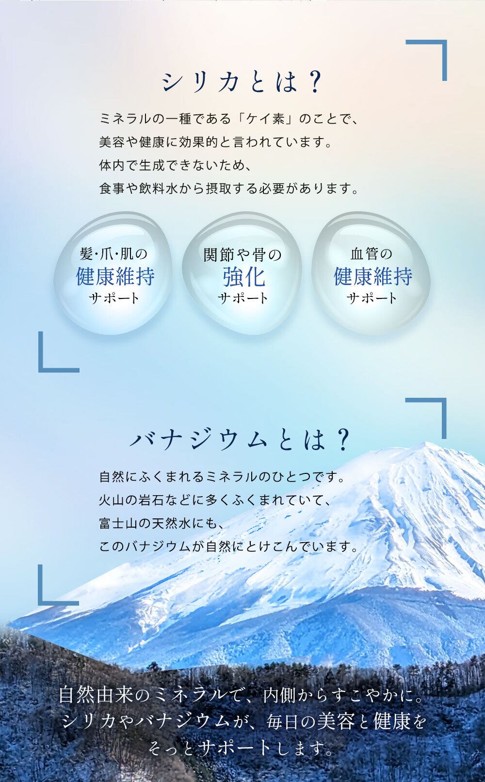 【可愛いおしゃれデザイン】天然バナジウムがたっぷり入った富士山麓の天然水 富士山麓に降った雨や雪が地中に染み込み、幾層もの溶岩に長い年月をかけて濾過され磨かれたバナジウム天然水。 pH7.6の弱アルカリ性の水は、すっきりとしたやさしい飲み心地となっています。